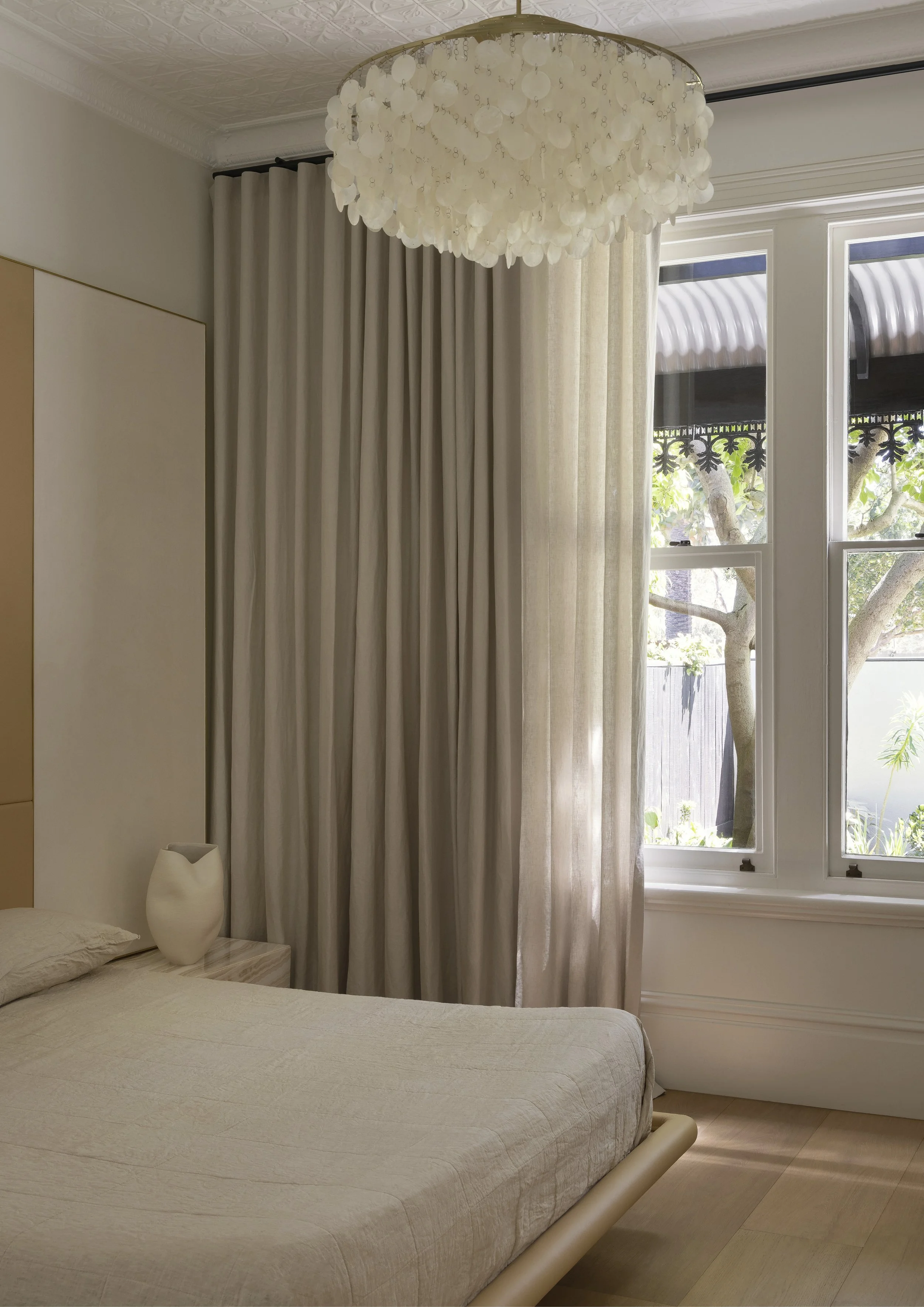 Inside, the front rooms retain their formal arrangement and detailing, with pressed-metal ceilings and restored trims, while new pale oak floorboards and Venetian plaster offer a contemporary edge. In a small but significant move, Pohio Adams raised the heights of the door frames, introducing increased fluidity without disrupting the original framework. The living space is flooded with light, which streams in through large expanses of glass blocks on the northern and southern sides.