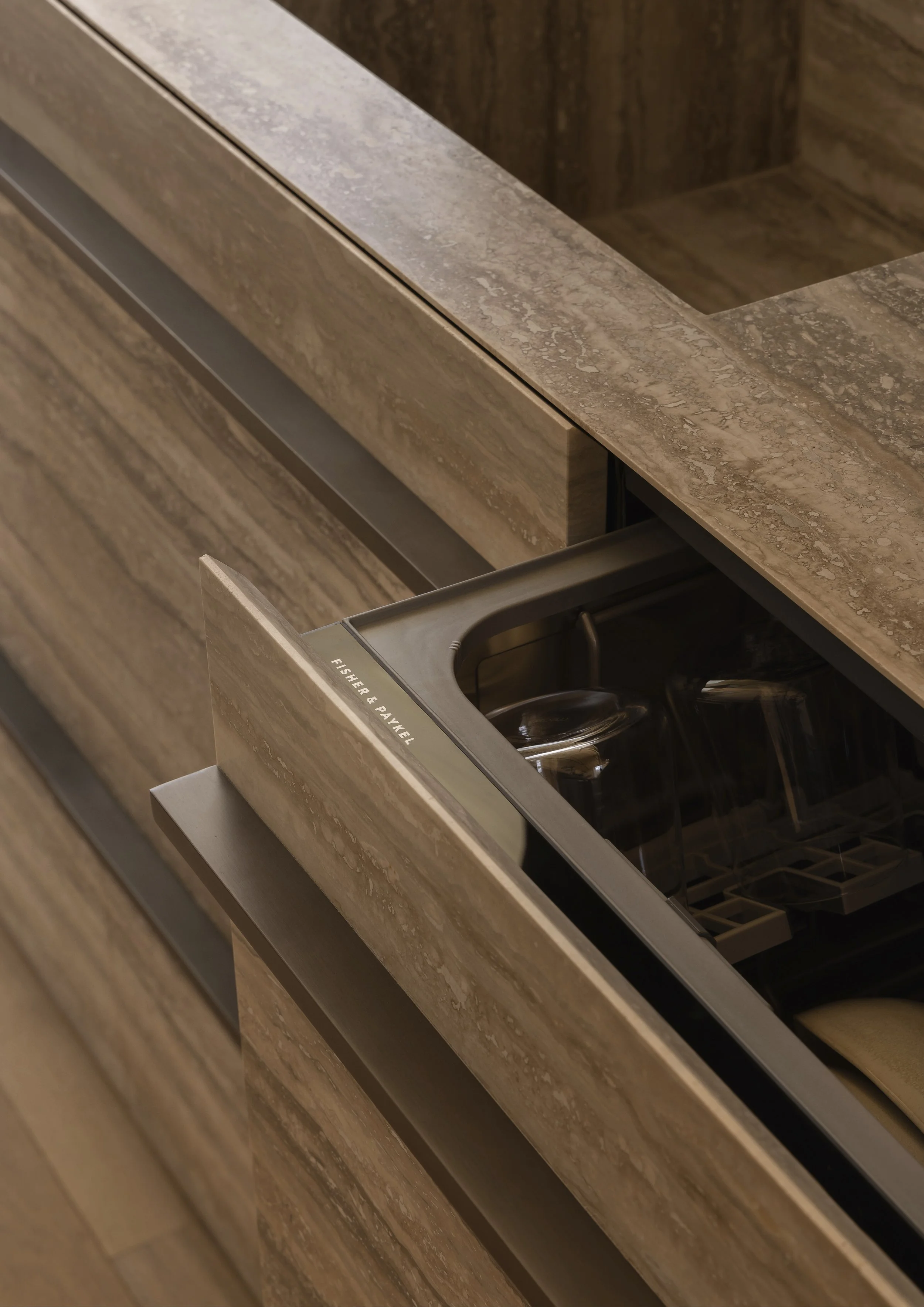 Encased in timber, the kitchen seems to be carved from the forms that surround it. A six-metre travertine island bench and sleek Fisher & Paykel appliances denote its inherent function as a place of gathering, eating and cooking. However, it is decidedly sculptural and almost abstract in appearance.