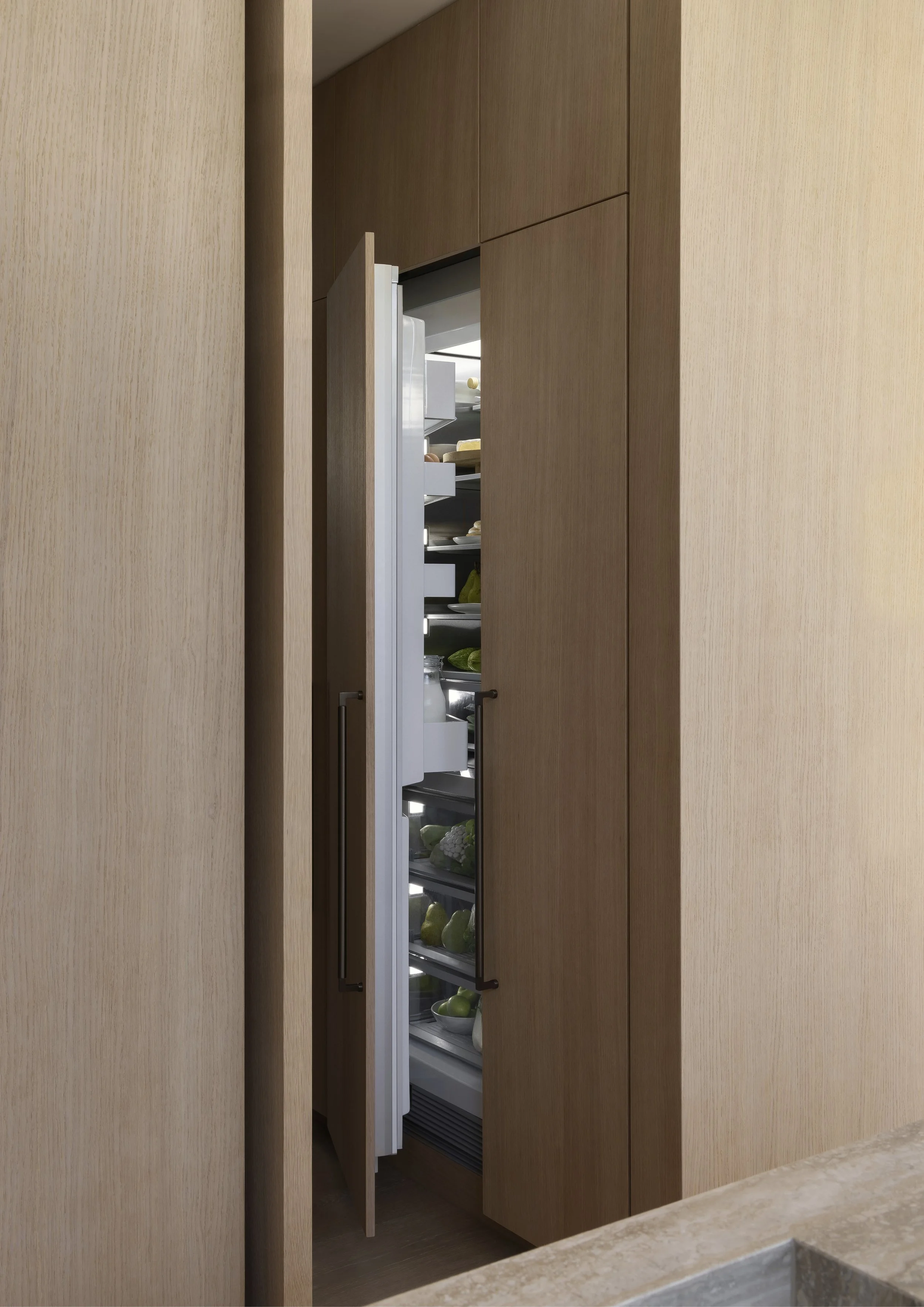 As a space to traverse and pause, it demanded a deeply nuanced response regarding aesthetics and utility, and unifying these qualities was the architects’ defining challenge. ‘It’s a very functional kitchen, but it has a calm and restrained approach to how that works. The induction cooktop is a simple black surface that sits perfectly flush with the travertine. The ovens do the same on the back wall — they’re all black with a low-key display and the mirrored surface gives you a subtlety. Compositionally, it’s beautiful,’ says Adams.