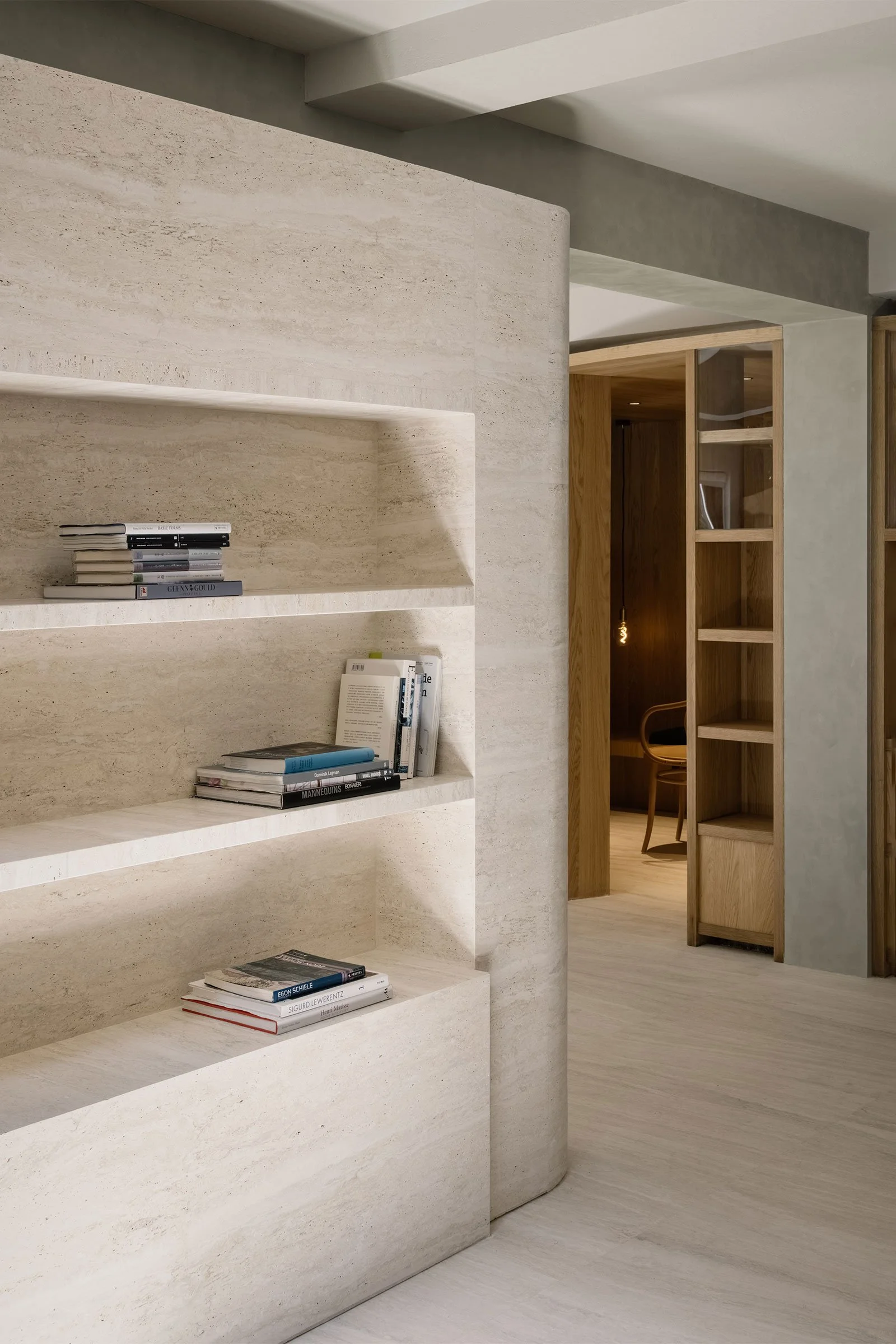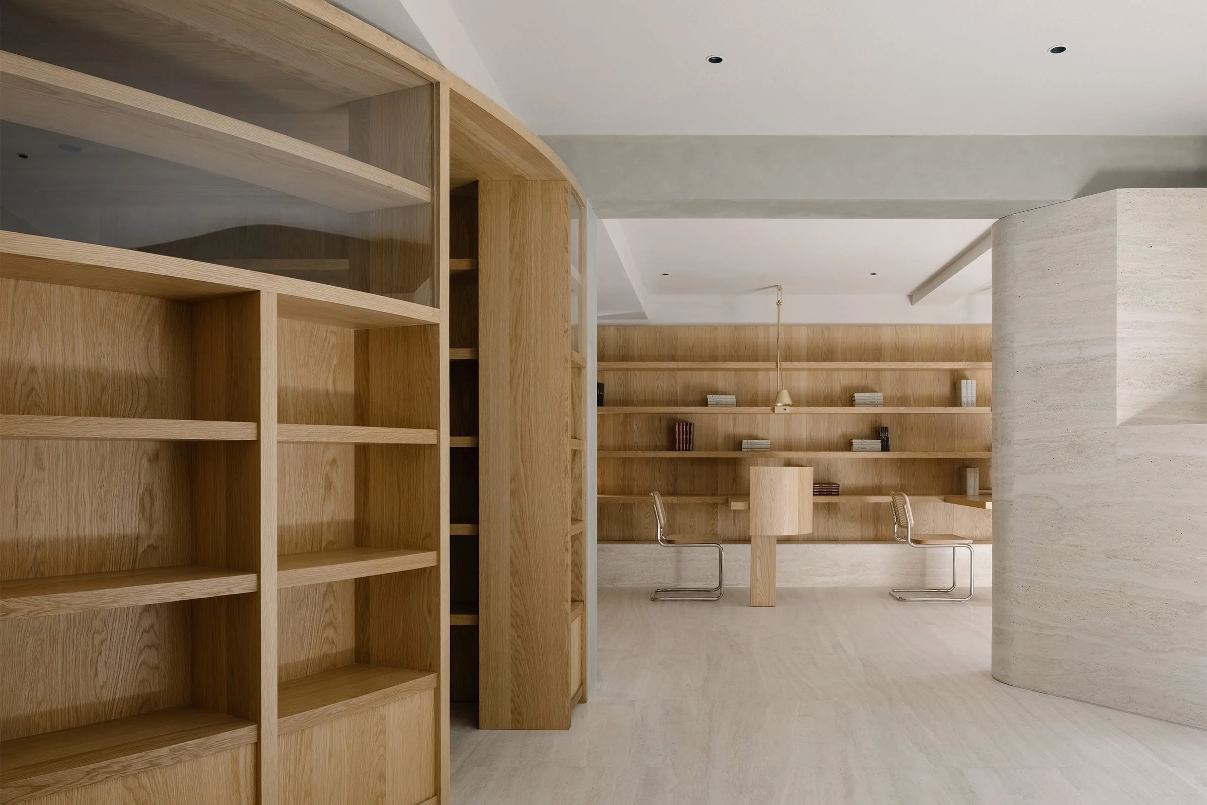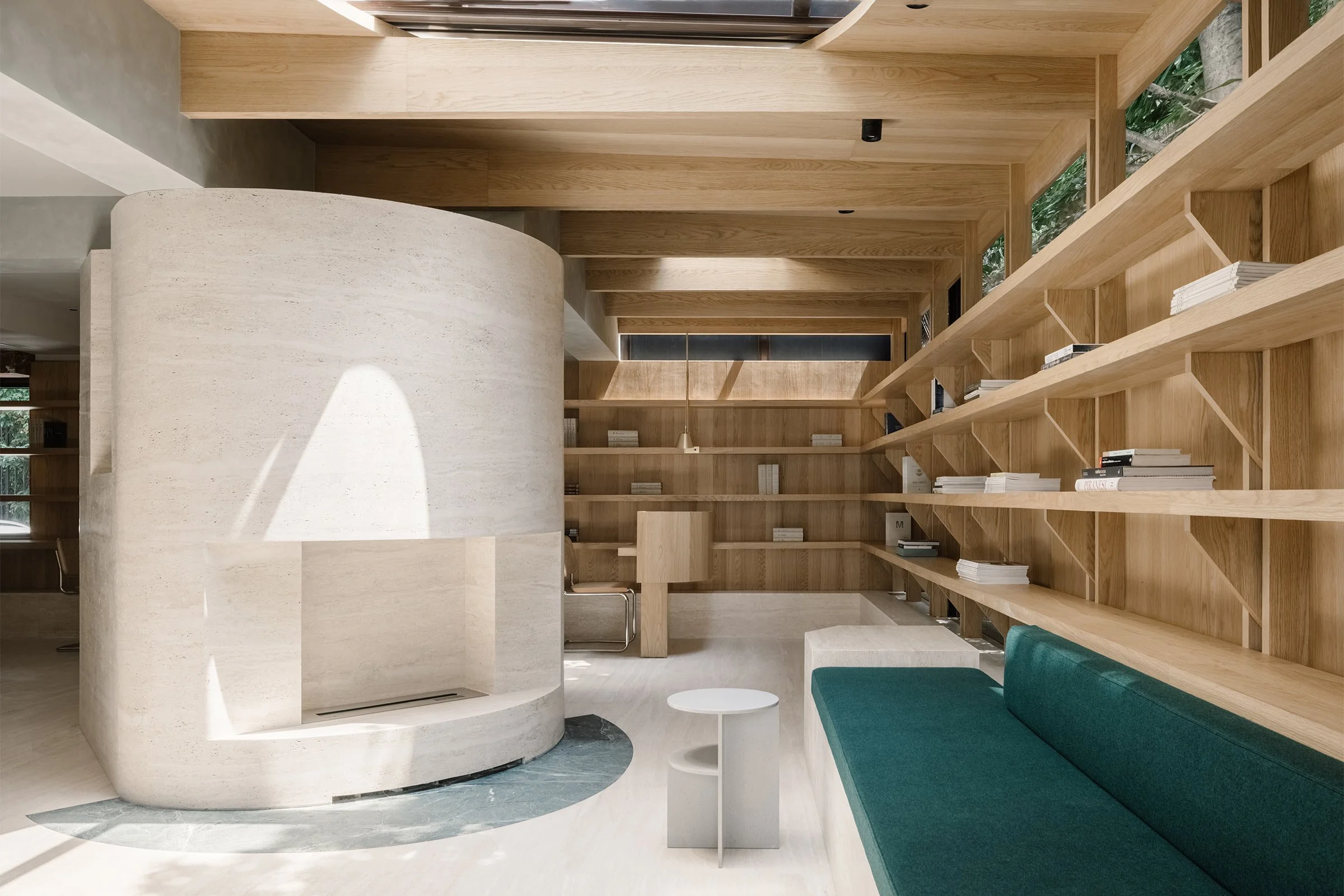 ‘As it’s a shared reading room, we needed to create a relatively open and fluid space,’ says Cai. ‘Without changing the original structure of the building, we reorganised the circulation.’ A set of semi-circular bookshelves were incorporated to connect the two rooms into one, forming two small quiet reading corners. The remaining structural walls connecting to the glasshouse were wrapped in off-white travertine, creating an independent sculpture in the space. In the existing glasshouse, a timber structure was inserted with wooden beams and columns integrating with the bookshelves, and round and square skylights were cut out of the new timber ceiling to bring natural light into the centre of the room.
