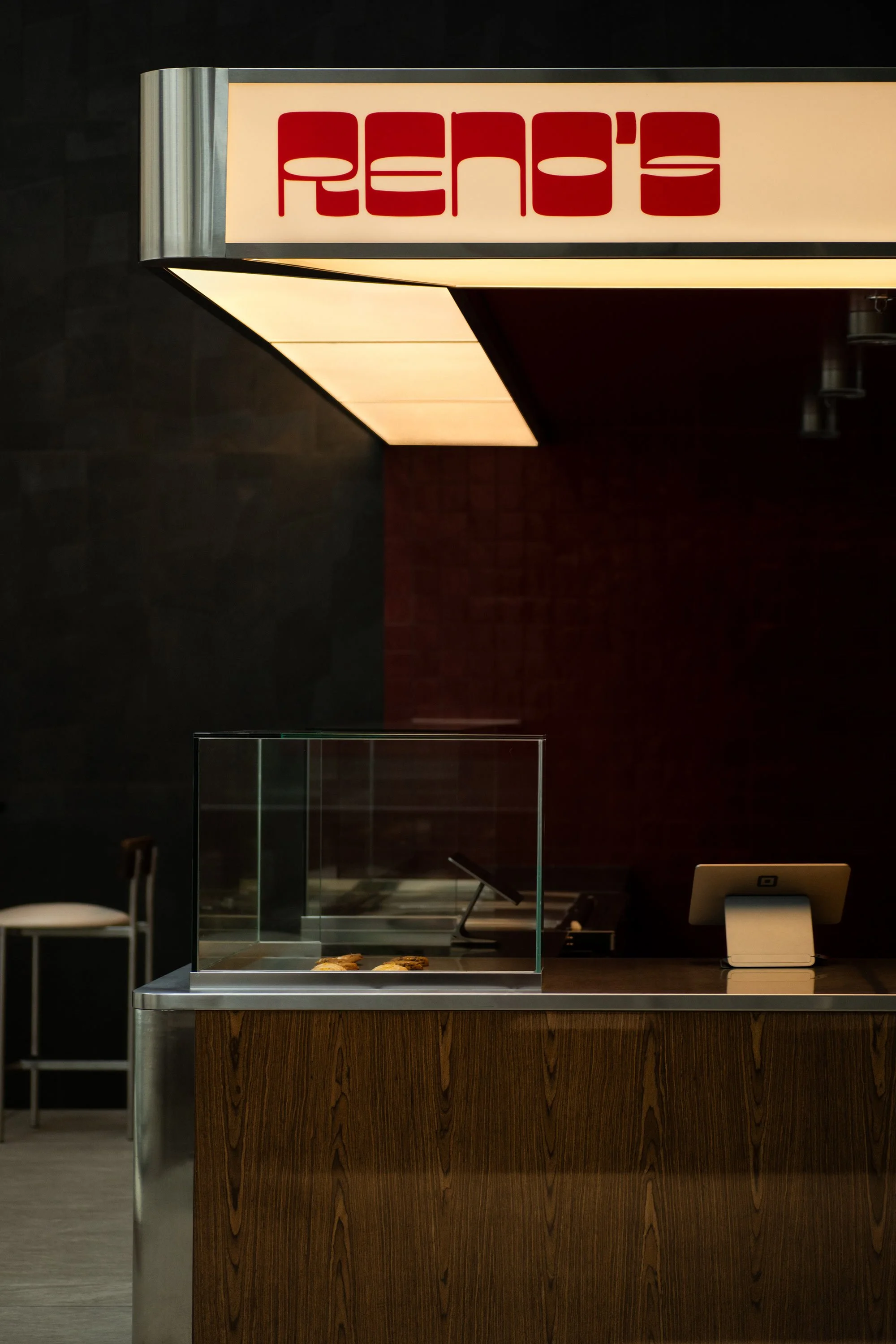 Throughout the space (and subtly hinted at from the glossy and pillowy street sign on the building’s exterior), materiality sets the tone. High-gloss timber reflects a mid-century Italian sensibility, polished steel retains a utilitarian touch, and handmade ceramic tiled walls ground and wrap the kitchen with rich texture. If Reno’s Bistro were a person, Rowlands imagines someone distinctly familiar: ‘A classic Italian host — they know your name, ask about your weekend. The back-of-house is loud. There’s something welcoming and familiar, even if you can’t quite name why.’