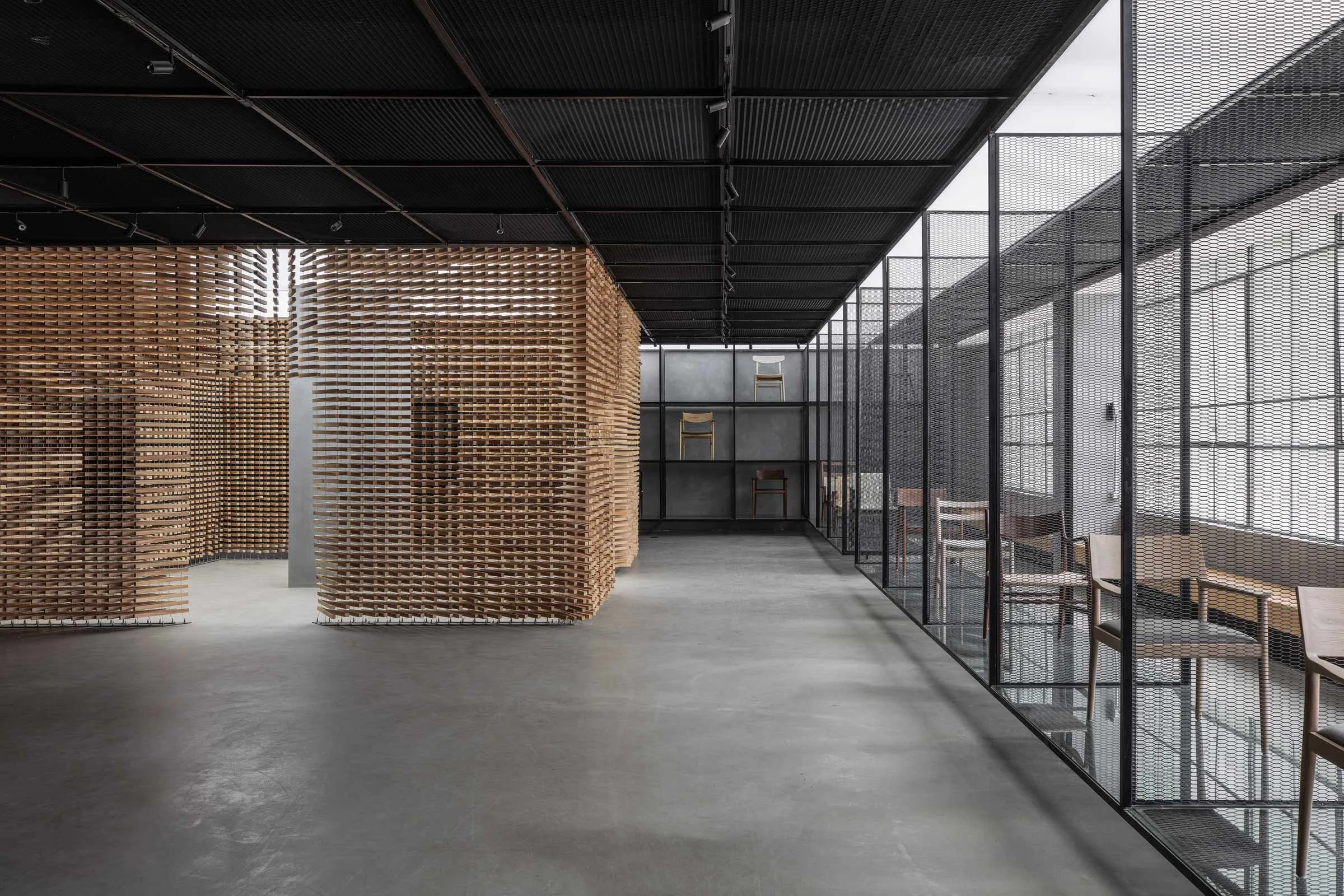 YC: For the ‘nest’ element, we used wood that that has been reprocessed from scraps discarded during furniture production. The rest of the space is made of dark grey steel, which creates a strong contrast with the natural warmth of wood.