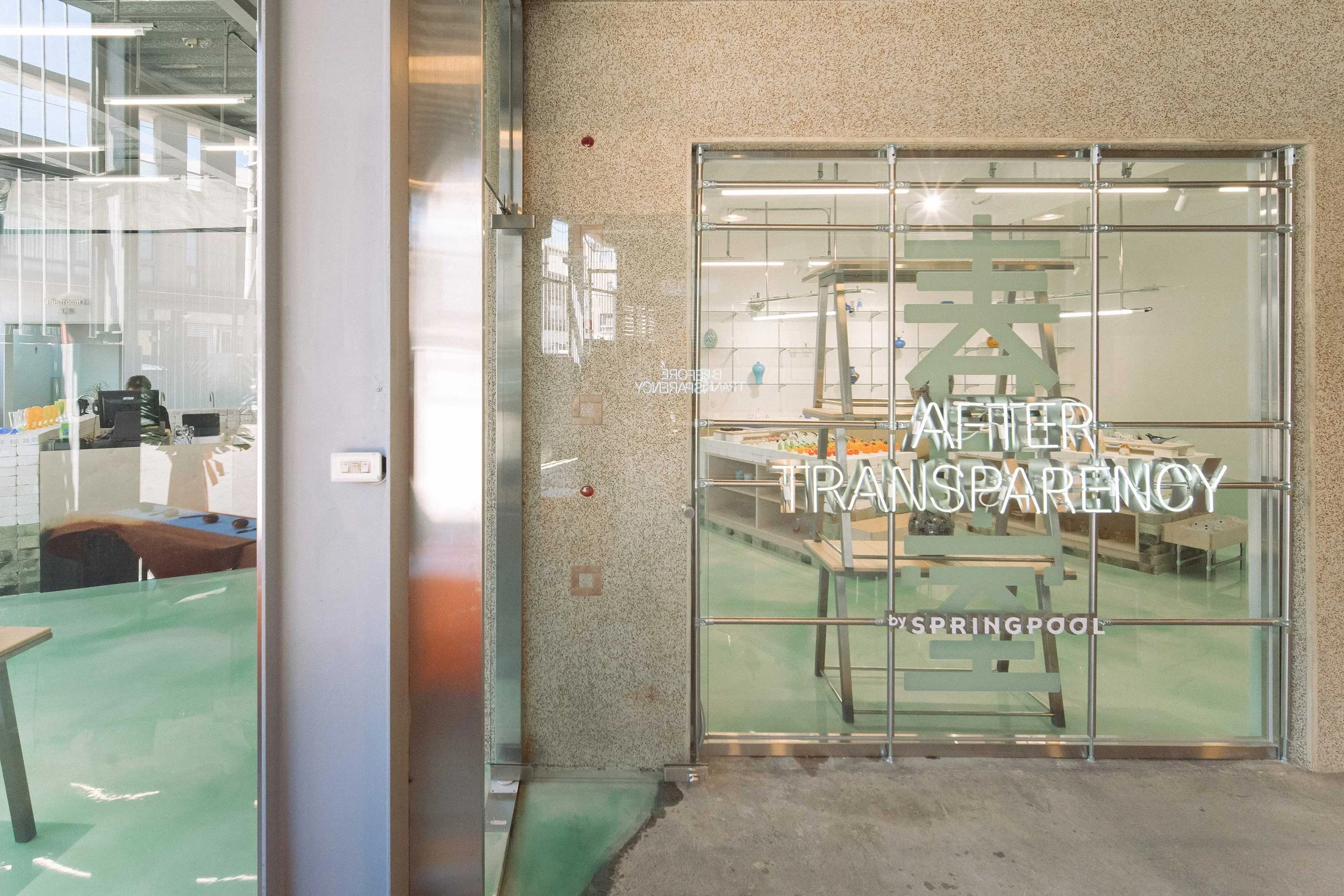 The journey begins at the Spring Pool Glass Studio, a retail-like entry that softens the threshold between public and industrial space. Here, a crisp 4,000K light defines the atmosphere, while a green-toned epoxy floor subtly evokes the reflective surface of water, a reference to the ‘pool’ in Spring Pool Glass.
