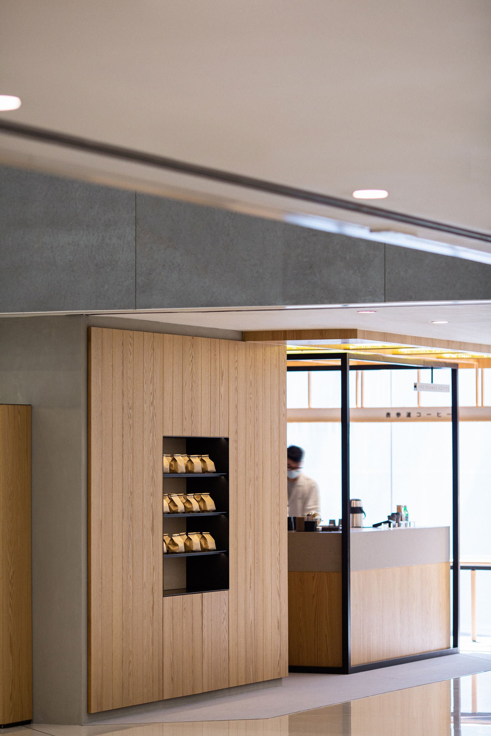 The slanted grid ceiling is another design highlight. We didn’t design it just to look nice, but also to reflect the sunlight from outside and project a warm glow into the cafe. It makes you feel like you’re enjoying a cup of coffee under a cosy Japanese pavilion, secluded from the busy shopping mall.