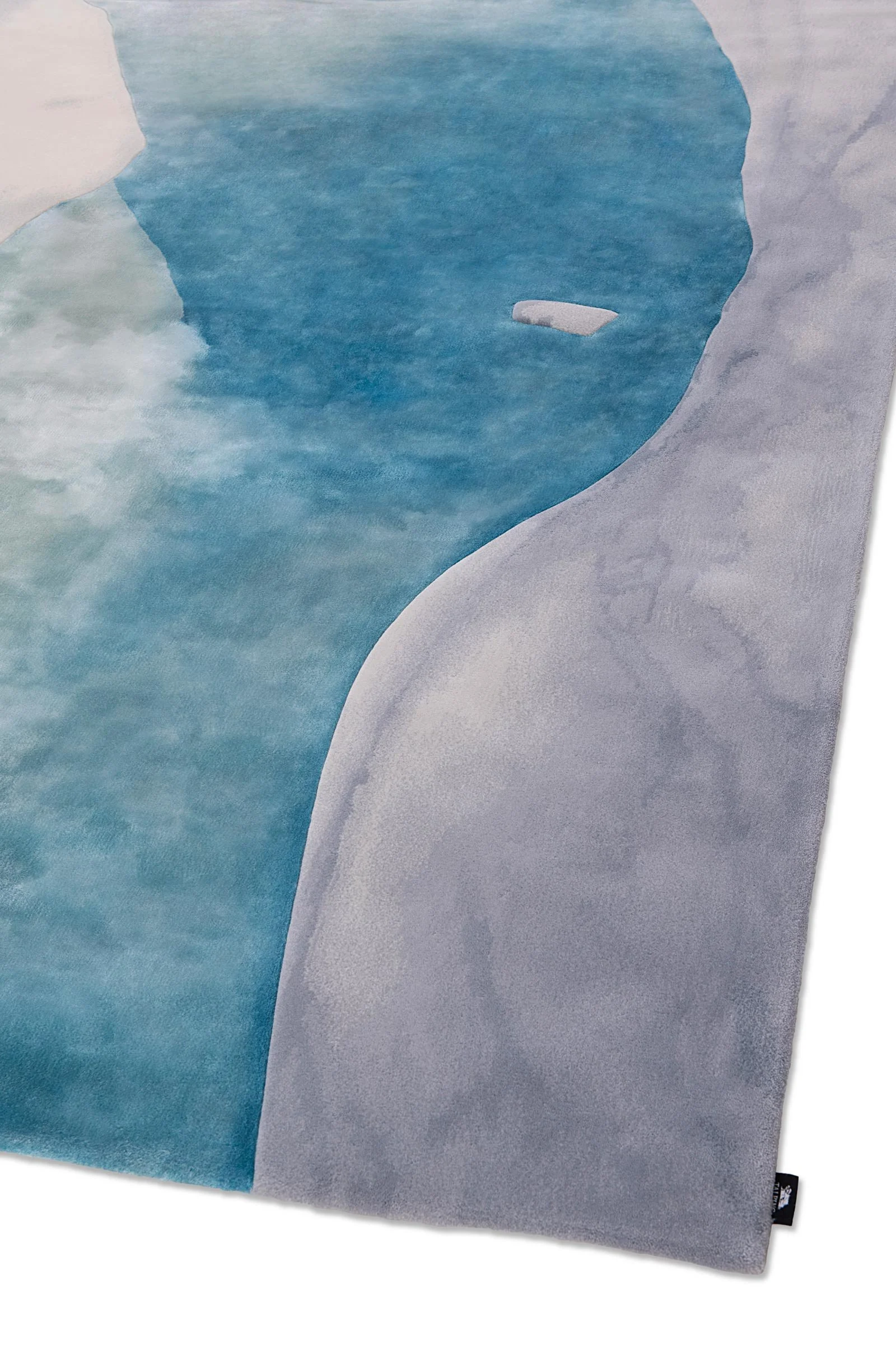 Depicting various aquatic environments from an aerial perspective, the collection’s eleven designs evoke the poetry of water while making subtle comments on the impact of climate change. From waves washing over the shores of pristine beaches to streams flowing through the surface of melting icefields, the horizontal images invite contemplation and echo the boat’s surroundings.