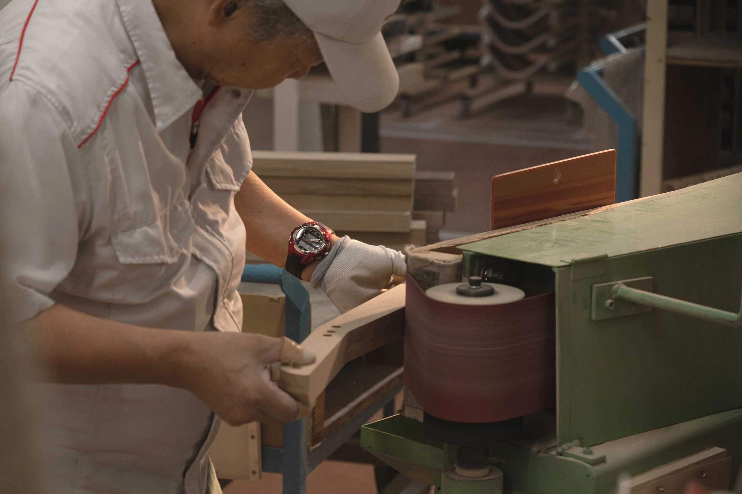 High-tech and high-touch are two words that succinctly sum up the philosophy behind the production process for all Karimoku Furniture pieces. The company navigates a sensitive line between two worlds, embracing the deeply rooted craft for which its home prefecture of Aichi has long been famed, while also openly exploring the latest technological manufacturing developments. Aichi Prefecture has a rich history of industry, rooted in a commitment to quality and production efficiency. This heritage has had a significant influence on Karimoku Furniture’s production processes, in which individuals are entrusted with finishing and other intricate tasks, while machines handle other aspects of production.