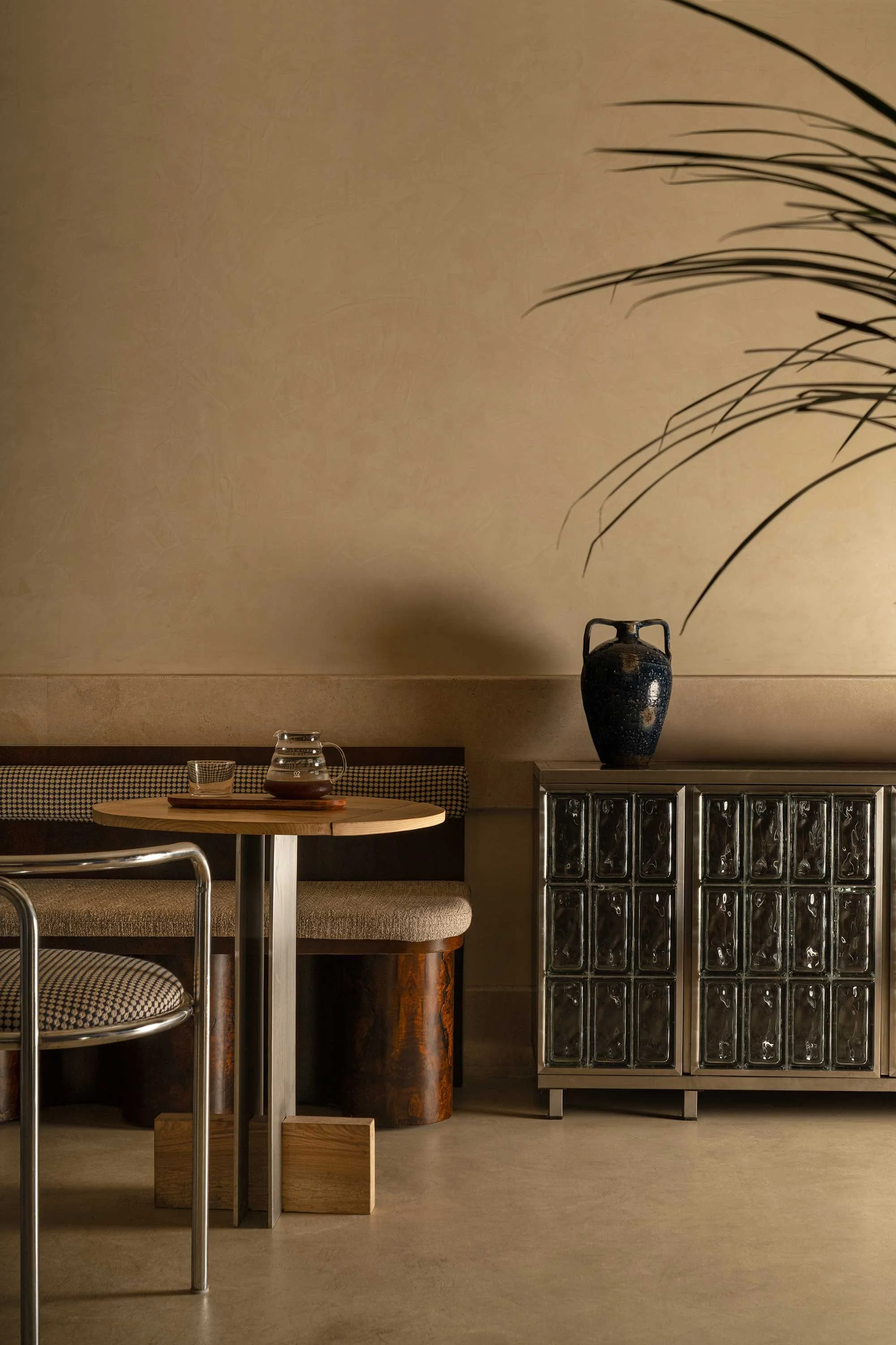 In Delhi’s Greater Kailash 2, Libertario Coffee Roasters offers a refreshingly polished take on the city’s evolving cafe culture. Founded by Miguel Villaquiran and Arushi Mehra, the space is designed by Aayushi Malik to break away from typical cafe tropes. The interiors are elegant but industrial, utilising varied finishes of stainless steel — brushed, polished and chromed — alongside a reflective ceiling that amplifies the volume. Softened by micro-concrete surfaces and striking blue tiling, the venue feels immersive and international.