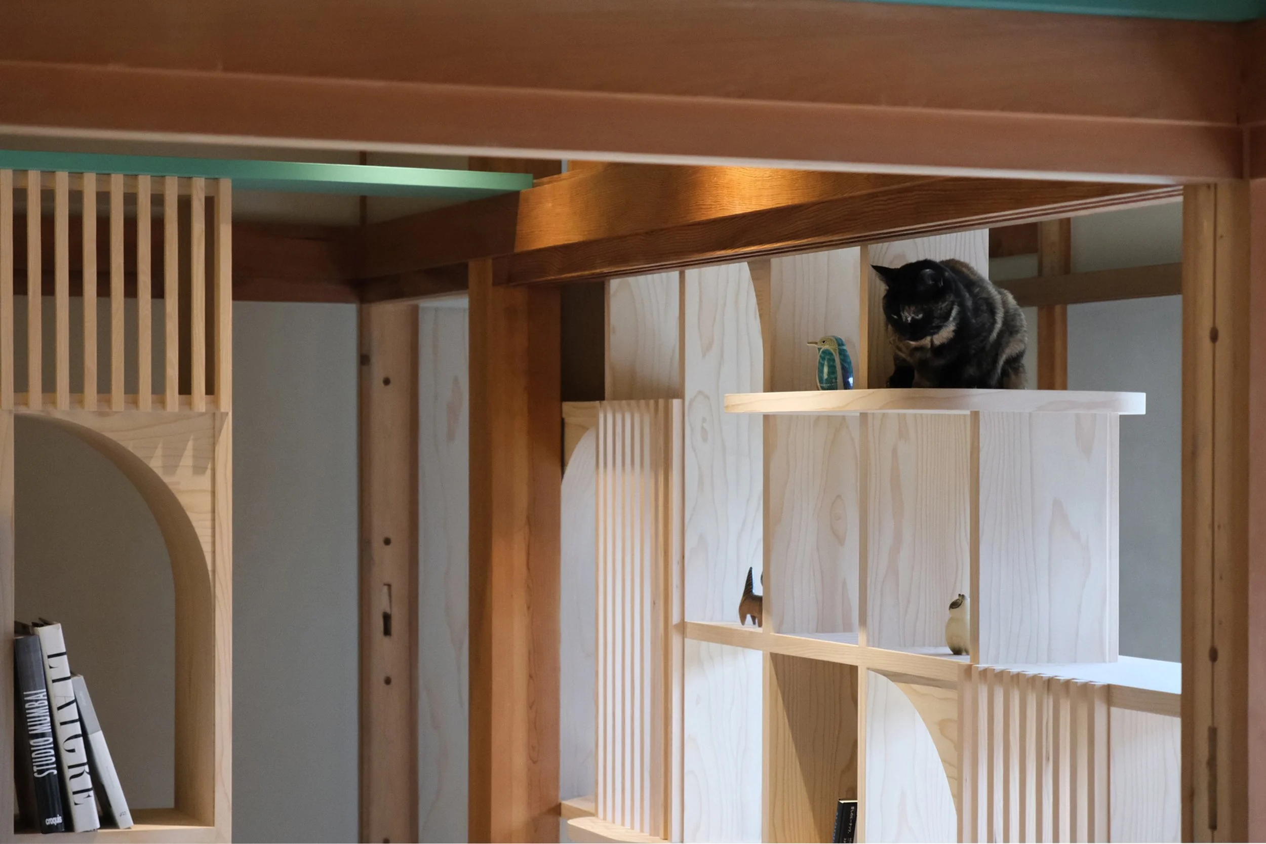 New elements were designed with a modern touch, bringing freshness and an intriguing juxtaposition. ‘The custom shelving incorporates rounded shapes inspired by the original rain gutters, connecting seamlessly with a walkway for the couple’s beloved cat,’ says Kitawaki. ‘Traditional Japanese houses may appear to be composed purely of straight lines, but when observed closely, soft curves are subtly integrated throughout,’ he points out. ‘I introduced gentle curves and smaller-scale elements to create a rhythm distinct from that of the existing architecture. By interpreting this characteristic in an expanded way, I was able to elevate it into a new design expression.’