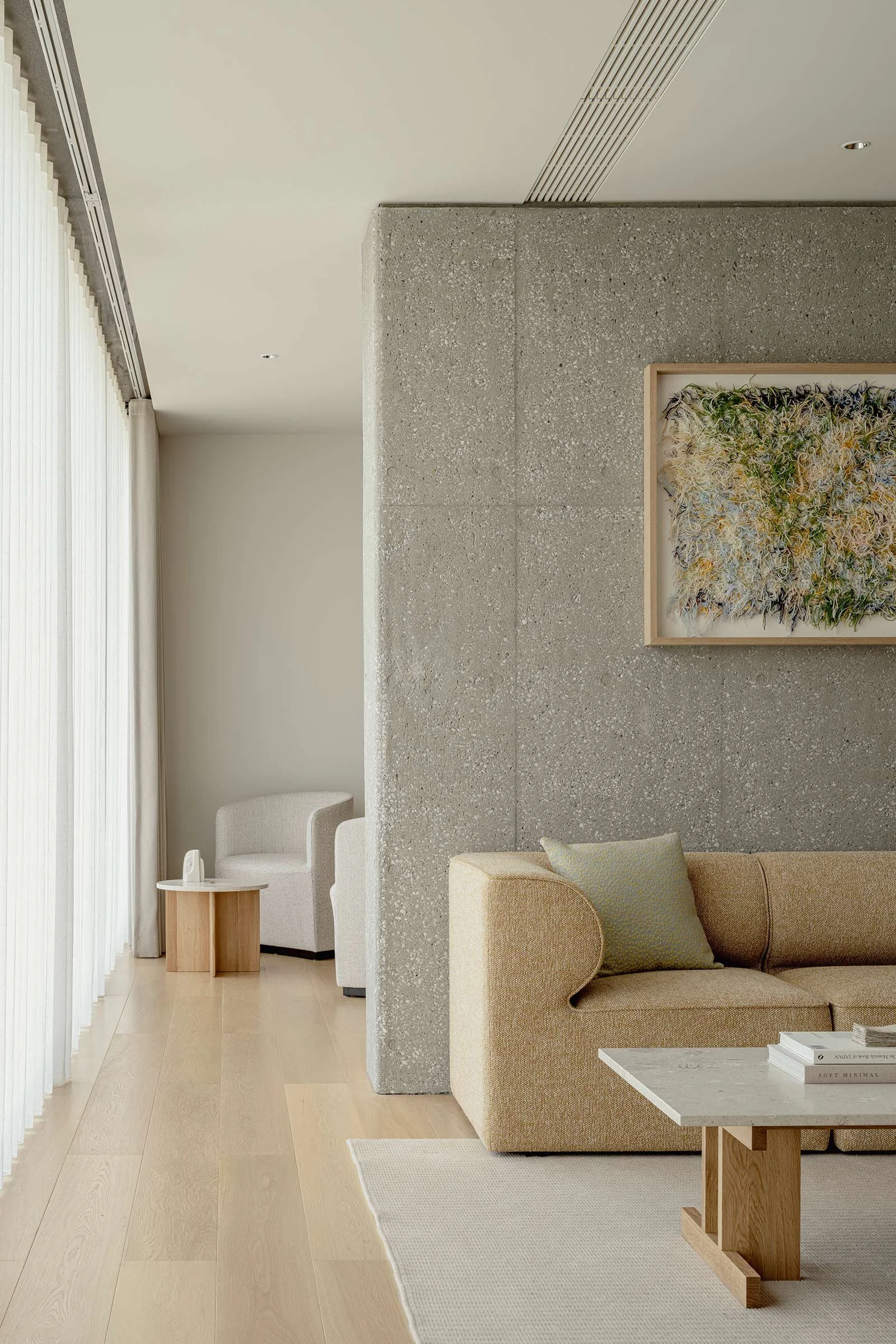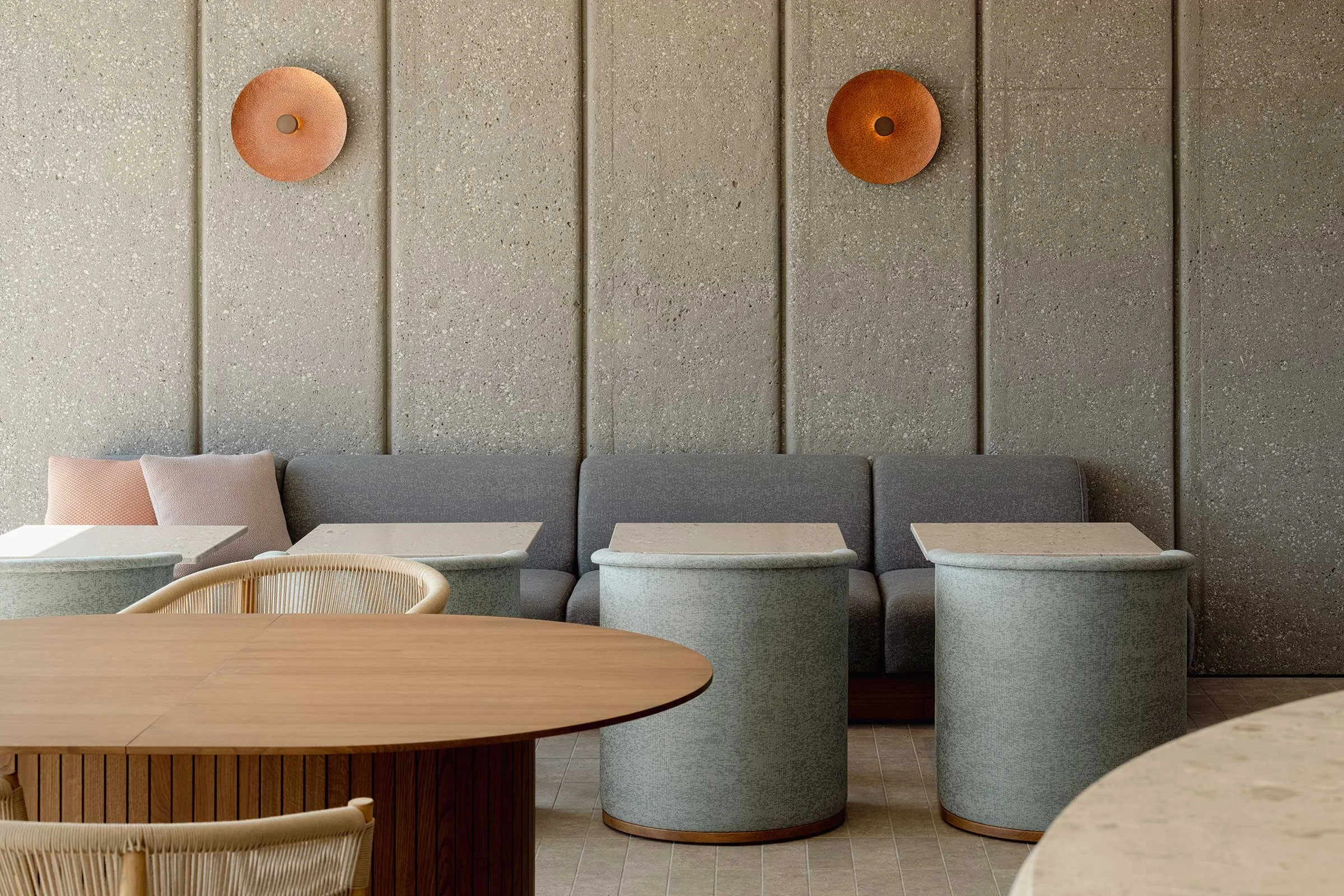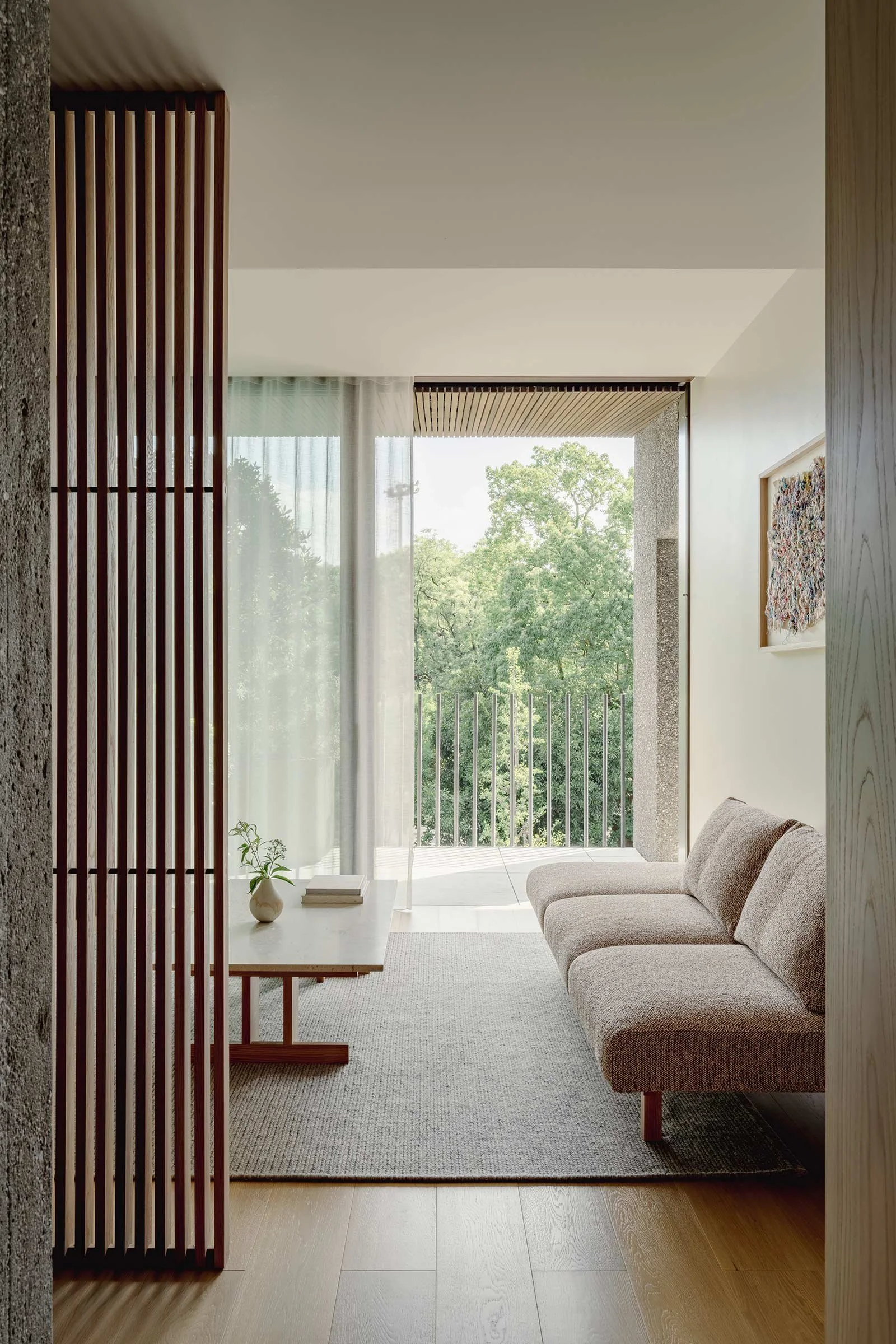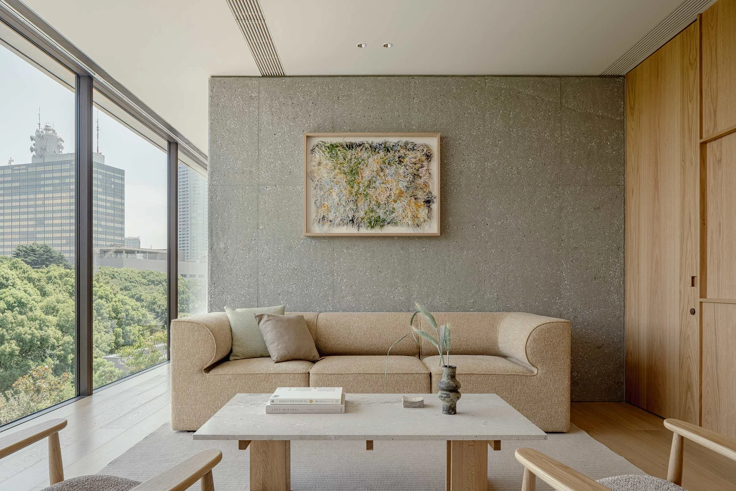 The Brutalist-like structure, constructed with exposed raw concrete, is softened with wooden louvres and lush plantings, to allow ‘continuity with the greenery of Yoyogi Park’, explains Ashizawa. Inside, the raw concrete continues, albeit in a different finish, and natural materials abound. The design team ‘adopted colours that evoke the touch of nature to create an environment where people can rest and relax in the middle of Tokyo, a city that’s always moving,’ he adds.
